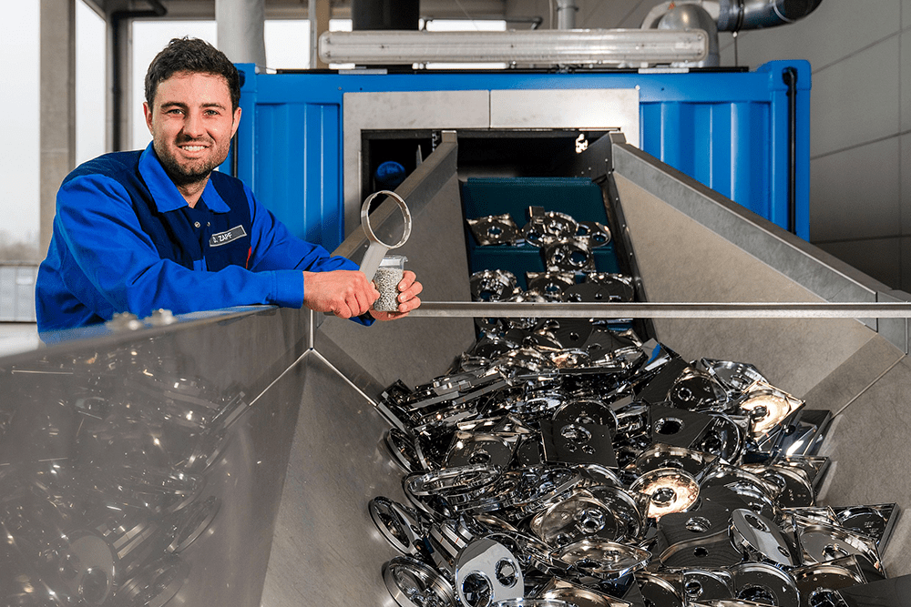 “Our plan for the new recycling plant therefore gradually took shape as a highly automated processing line in which the continuously fed defective parts primarily pass through three process steps: Firstly, systematic pre-grinding with dust extraction, then separation of the chrome layer using the shock wave process, and finally magnetic separation, so that we obtain two unmixed plastic and metal fractions that we can feed into granulation on the one hand and marketing on the other,” reports David Zapf.