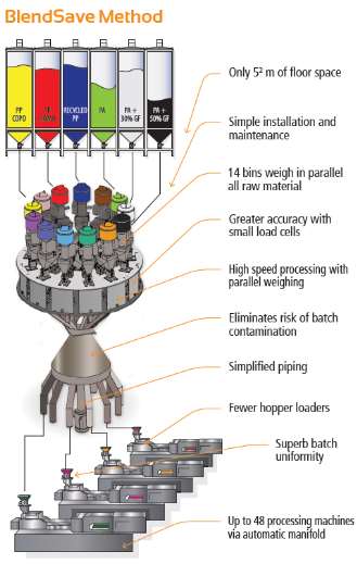 BlendSave is a centralised blender consisting of up to 14 individual weighing chambers fed directly from silos or containers, a common funnel and an automatic manifold for distributing whole batches to the appropriate processing machine.