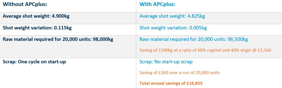 This example represents 26 days of production to manufacture 20,000 products, for a total saving of £1826, or a £70.23 saving every day. For a typical 48-week, 5-day week manufacturer, this represents an annual saving potential of £16,855, without factoring in additional savings such as purging, training and more.