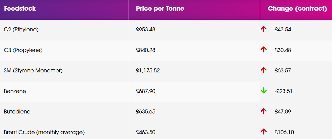 C2 Ethylene rose by €50 / MT and C3 Propylene rose by €35 / MT, but these are not that relevant this month, considering the supply chain disruption.