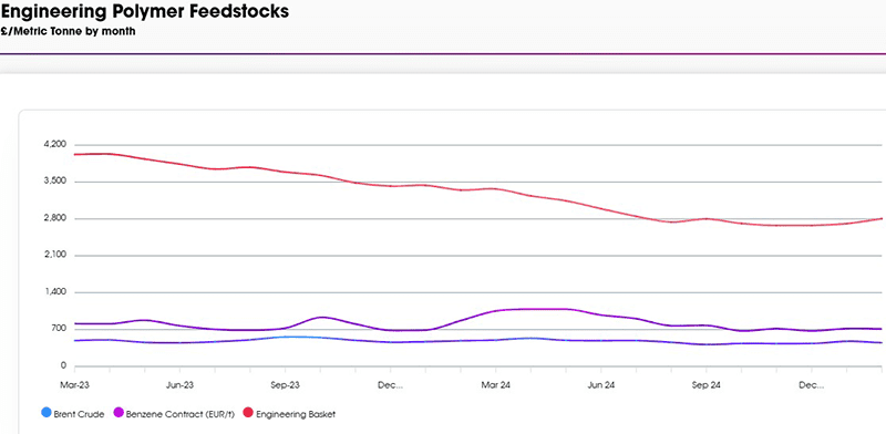 Plastribution’s March Polymer Price Know-How shows minimal movement in monomer prices following February’s increases. Polyolefins have largely rolled over, though LDPE remains an exception due to tighter supply. The uncertainty surrounding potential EU tariffs on US PE imports continues to cast a shadow over global trade flows, with supply chain disruptions likely in the months ahead. Meanwhile, Styrene Monomer has seen a significant price increase, and engineering polymers remain under pressure despite price hike attempts. The outlook for Q2 depends on evolving trade policies and supply adjustments.