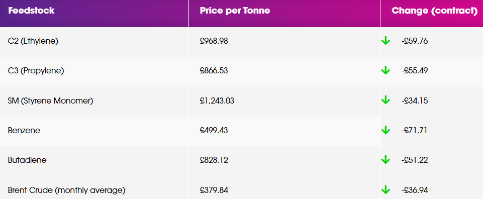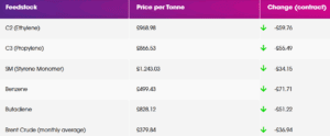 Crude Oil prices, a key indicator of global economic confidence, have recently fallen to a 4-year low as concerns continue about President Trump’s US import tariff policies. As can be seen in the table above, most monomer prices fell by a greater extent. The reaction to falling feedstock costs has been slightly muted in terms of polymer prices, but the downward pressure continues