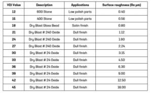 The surface finishes are categorised by numbers from 0 to 45 and go from high gloss to Texture finishes. The table below highlights the most common VDI finishes.