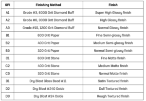 There are 12 SPI finishes grades, split between 4 categories. These range from a high-gloss to a textured finish; the grades are as follows: