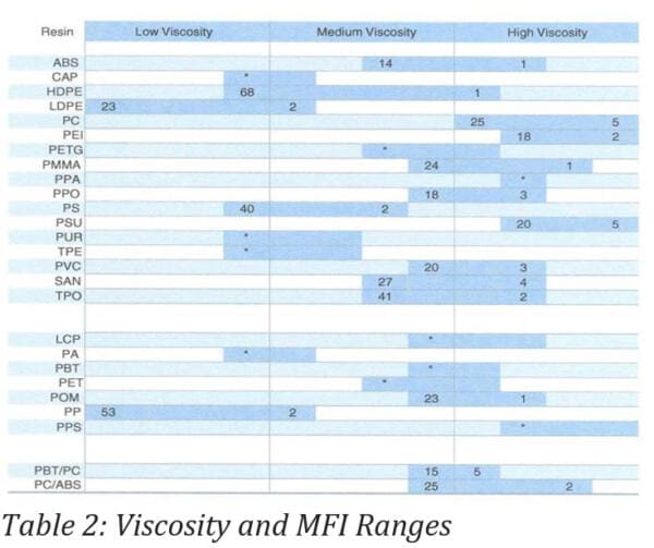 When we look at the melt delivery system, it is important not to undersize the system to ensure there is minimal pressure loss from the nozzle machine up to the gate. In most cases, semi-crystalline needs the smallest size, followed by amorphous, and bringing up the rear would be glass or fibre filled materials of any type. At a high-level, we can start to look at the MFI (shown in Table 2) of these resins. We can see in general viscosity of each particular resin and the MFI ranges. The lower the MFI, the larger the system needs to be sized for effective filling and packing of the cavity.