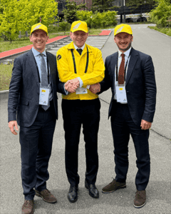 FANUC sealing the ROBODRILL partnership deal with YMT in Japan. Marco Ghirardello – FANUC Europe CEO (centre) pictured with Thomas Hillard (left) and Jack Pascoe (right) from YMT.